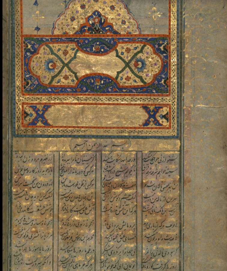 Author: Jalal al-Din Rumi, Maulana (Persian, 1207-1273). Illustration: Incipit Page with Illuminated Headpiece. ink and pigments on thin laid paper (probably Kashmiri), 1073 AH/AD 1663. The Walters Art Museum; Acquired by Henry Walters; W.626.3B; Ibrahim [date and mode of acquisition unknown] [round seal impression, Ibrahim (…) on front flyleaf iia]; Henry Walters, Baltimore [date and mode of acquisition unknown]; Walters Art Museum, 1931, JSTOR, https://jstor.org/stable/community.16017112.